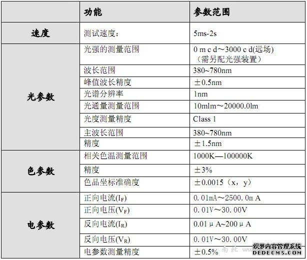应用功能 基于windows操作系统人机交换界面良好;标准SA905光纤接口,CCD高速光谱;可直接连接打印机打印测试报告,Excel保存数据,利于分析;一台主机配置相关装置,完全满足光源的光色电各种性能测试与分析,以及进行分选等相关试验。适用于实验室、质检部门研发测试,也可使用于快速测试、分选 LED 大功率管及各种发光源,特别针对大功率LED半成品上质量控制。自动化集成度高,分档设定。可配夹具。 技术特性 测量LED的光谱功率分布,色品坐标,相关色温,显色指数,色温差、峰值波长、光谱半宽度、主波长、色纯度、光通量、发光强度(配测试支架)、光效、正向电压、反向漏电流等光色电性能参数; 配有多种LED夹具,不同规格可定做夹具;适合1W/3W/5W/10W/20W等不同大功率LED分选,测试数据自动保存为Excel文件,方便数据分析; 技术指标