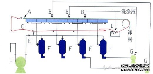 9659彩集团 A、加料装置 B、洗涤装置 C、纠偏装置 D、清洗装置 E、切换阀 F、排液分离器 G、洗涤泵