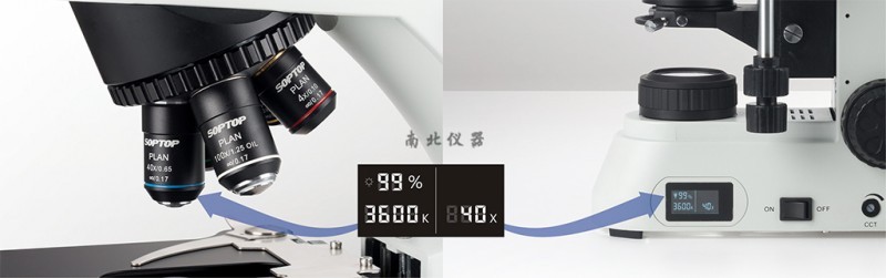 | 30°观察头,铰链式三目,铰链组可 360°旋转,便于眼点提升,固定式目镜筒,瞳距调节范围 50-75mm,固定式分光比,R :T=8 :2 | ||