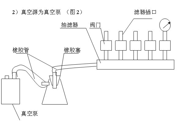2.将滤器接杆上的橡胶塞,插入不锈钢底座,滤器的多小孔平面上装上浸泡的滤膜,放上不锈钢滤器倒入水样至相应刻线,便可进行抽滤。