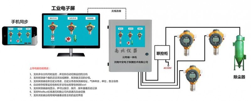 管理中心的主要有粉尘智能监测报警主机、监测测软件、联动控制柜,智能电子屏(电脑)组成。一般设置在监控中心办公室方便管理的场所。实现集中采集管理三个区域的现场粉尘数据、监测QD6360粉尘检测仪的运行状态。并通过联动控制柜驱动现场风机、喷淋、