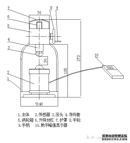 2、按下“峰值” 键,峰值指示灯亮,此时可以加荷,当试件破坏时显示器显示的示值为此试件的大强度值,单位为N.当做下一个试件时需按下“峰值”键使加荷指示灯亮,上一个试验数据消除,若显示仪显示的数值为零(显示仪有较小数值飘移属正常现象)再按下“峰值” 键使“峰值”指示灯亮,此时可加荷做下一个试验,若显示仪显示数值较大在“加荷”灯亮状态下按“置零”键使其清零.每次试验均需重复上述程序,但峰值指示灯不亮时显示仪没有峰值保护功能,显示数值会随着卸荷而自动消除.