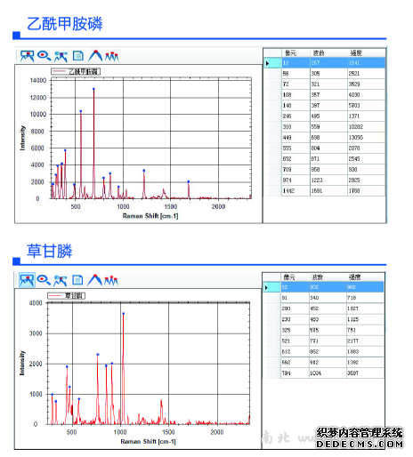 SSR系列检测仪提供的农、兽药拉曼光谱图谱库,由检验检疫科学研究院,中检国研(北京)科技有限公司,以及南京简智仪器设备有限公司联合采集。其标准品主要由Dr.Ehrenstorfer(DR)、sigma公司下的Riedel-de Han(RDH)、日本林纯药株式会社三家公司提供,共计642种农药、兽药。每一种农兽药除标准拉曼光谱图外,还包含其基本信息(包括英文通用名、中文通用名、CAS NO.、分子结构式、分子式、标准品购买厂商、货号、纯度、理化性质、用途),每一张拉曼谱图都标出特征峰位置。