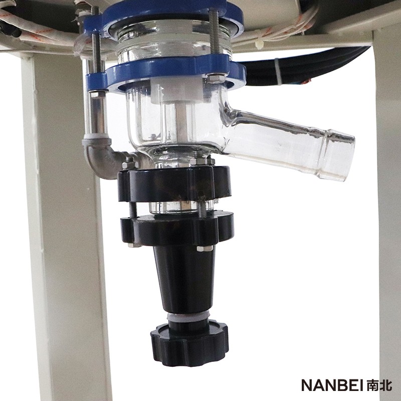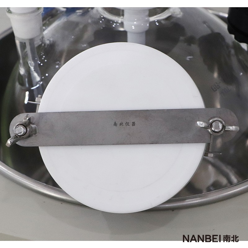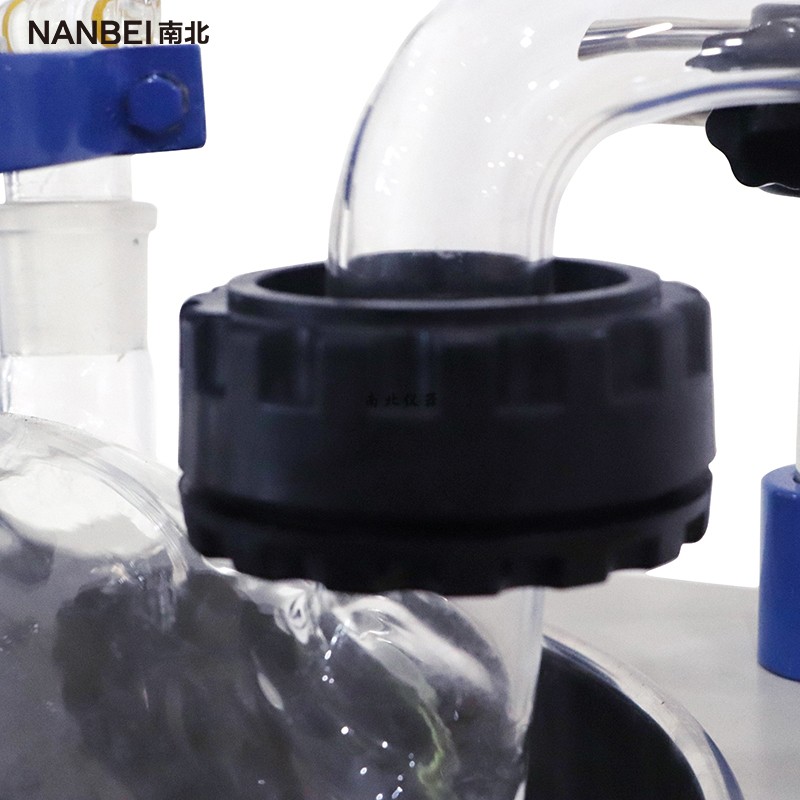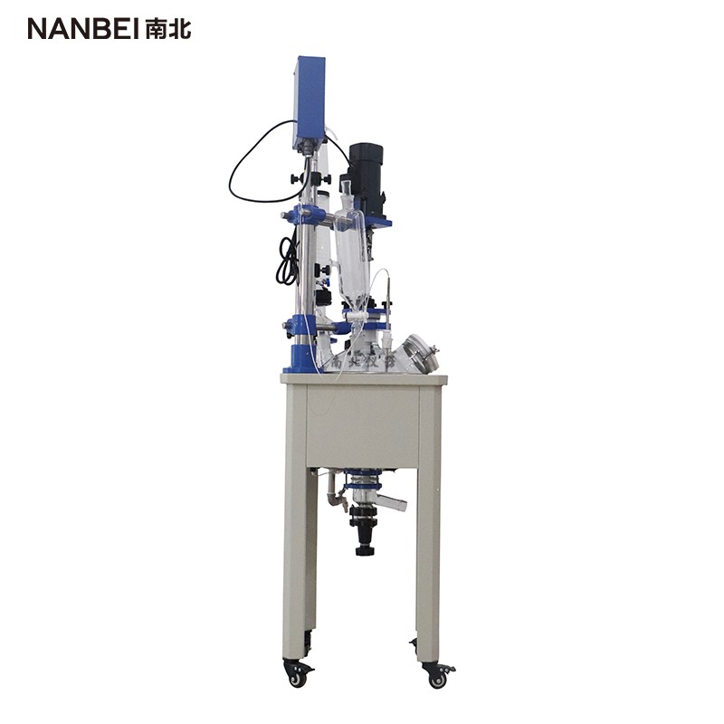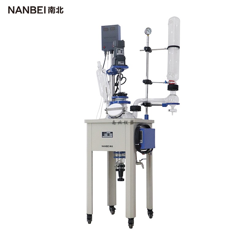 | 南北仪器单层玻璃反应釜具有电动恒速搅拌系统、冷凝、滴加系统、加热浴锅。在搅拌物料的同时,浴锅对釜内物料进行加热,在真空条件下可以提高蒸发效率(需连接真空装置),溶媒蒸汽经玻璃冷凝盘管时冷却成液体(需连接冷却装置),可回流到釜内,也可通过回流弯头下部阀门进行回收。反应完毕,物料可从釜底的侧出料口放出。