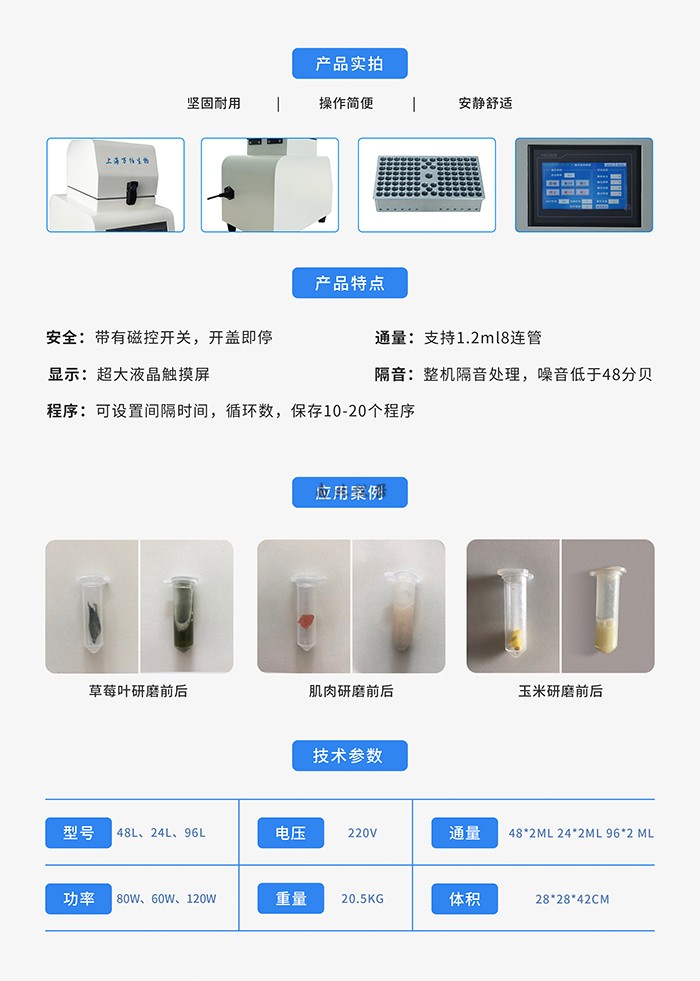 2.适用于各种动物组织包括大脑、心脏、肺、胃、肝脏、胸腺、肾脏、肠、淋巴结、肌肉、骨骼等样品的研磨破碎;