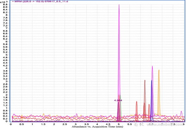 0.5ppb的β2-受体激动剂的MRM谱图【十一种受体激动剂,特布它林,齐帕特罗,沙丁胺醇,塞曼特罗,莱克多巴胺,妥布特罗,克伦特罗(瘦肉精),溴布特罗,克仑潘特,马布特罗和马喷特罗】